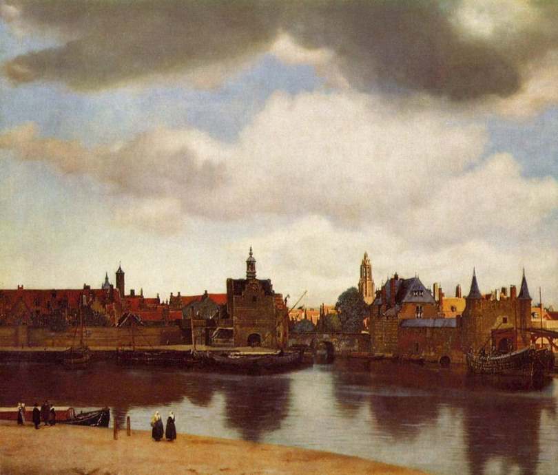 Proust tenait la Vue de Delft de Vermeer pour le plus beau tableau du monde. On n’est pas loin de lui donner raison. Oserons-nous dire que les reproductions ne lui rendent pas justice et qu’il vaut la peine d’aller la voir, superbement restaurée, au Mauritshuis de La Haye ? Ce qui est particulier à cette œuvre en apparence très différente des autres tableaux du peintre, c’est en fait la transposition au paysage des couleurs qui sont celles des vêtements dans les scènes d’intérieur : l’harmonie de bleu, de jaune, de blanc de La Jeune Fille à la perle, de La Dentellière ou de La Laitière : un ciel d’une légèreté et d’une transparence admirables, avec nuages blancs, un banc de sable au premier plan, avec de petits personnages.